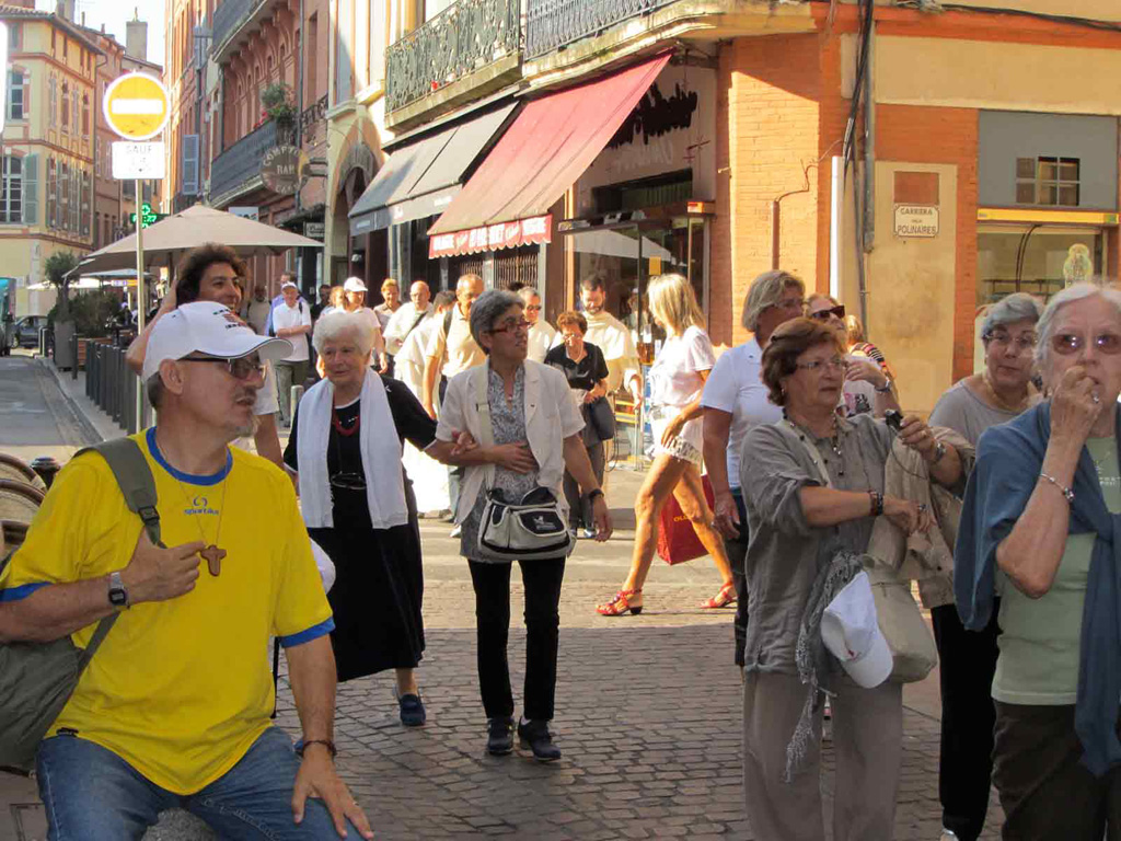 A Toulouse, la prima tappa prevista è per la Maison Seilhan, ma siamo in anticipo e abbiamo il tempo di ammirare una delle meraviglie della città: l’hotel d’Assézat, sede dell’Accadémie des Jeux Floraux, una delle più antiche d'Europa. Appena entrati nel cortiletto, Padre Garrigues introduce un primo gruppo di 30 persone nell'aula magna per tenerci una conferenza mentre Mme Claire, ci fa visitare la casa/museo (la sala dei miracoli, quella dei ritratti e delle miniature e l'Oratorio, ex camera del Santo). Il “Padrecito” (Alberto) mi spedisce con lei e il 2° gruppo, per tradurre. Poi i gruppi s'invertono. Dopo di che, ci organizzano per una Messa Commemorativa nella stessa Aula Magna. Ritorno in albergo per il pranzo. Dopo una breve sosta, si riparte per visitare Les Jacobins che, oltre essere una meraviglia per i suoi altissimi archi a palmizi (una rarità!) conserva i resti di Saint Thomas d'Aquino a cui è dedicata. Visita del Convento/Museo (allietata dalla ripetizione di un concerto per pianoforte che si terrà la sera stessa) e delle sue meraviglie. Non si possono trascurare la Basilica di Saint Sernin con la sua splendida struttura slanciata e il suo Tesoro, né la chiesa del Taur col suo campanile tolosano a muro, i resti di San Saturnino (una coincidenza?) e il mosaico d'altare. Ci siamo meritato un bel gelato sotto le arcate di Place du Capitole. Soffia una fresca brezza, la serata è tiepida e dolce, chi se ne vuole andare? Ma la cena aspetta e la giornata di domani sarà dura.