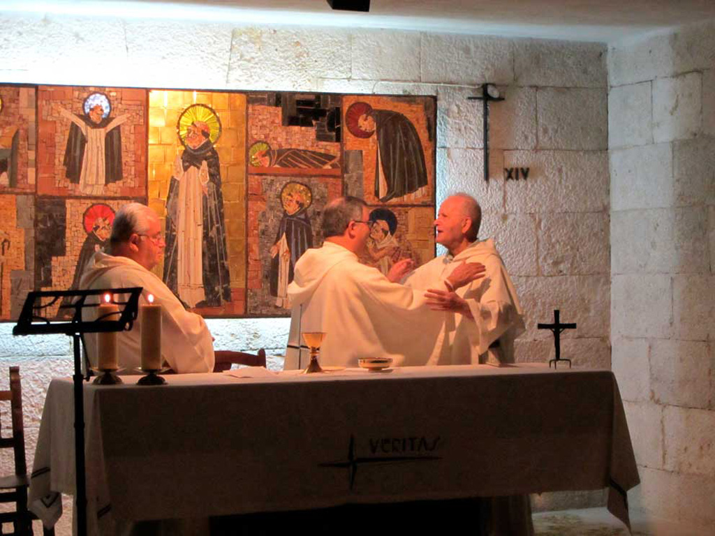 Visita breve perché, dopo il pranzo, bisogna riprendere la strada per andare a Caleruega, che costituisce uno dei fulcri del nostro pellegrinaggio. La campagna si snoda arida e collinosa sotto i nostri occhi; il tragitto sarebbe stato monotono se non fosse stato per la recita cantata dei vespri che ben s'intonavano con i luoghi e lo spirito del viaggio. Ed ecco, quando meno te l’aspetti, le lunghe austere mura di un convento indicano che siamo arrivati. Appena scesi dai mezzi di trasporto, due domenicani e uno studente prendono in mano la nostra confusa assemblea e ci guidano verso le zone rispettive di alloggio. Il convento è immenso, tirato a lucido, ricco di memorie e di oggetti antichi. I giardini che s’intravedono dalle finestre sono ben curati. Si respira la pace e l’operosità. Dopo la cena, semplice ma gradevole, un gruppetto di noi si dirige verso la piccola altura, dominata da una croce, dove il giovane Domenico saliva per osservare la sua terra, sognare ma anche giocare con gli altri monelli del paese. Da lassù, l'occhio si perde su una vasta pianura monotona e, tutto sommato, un po’ triste.