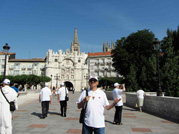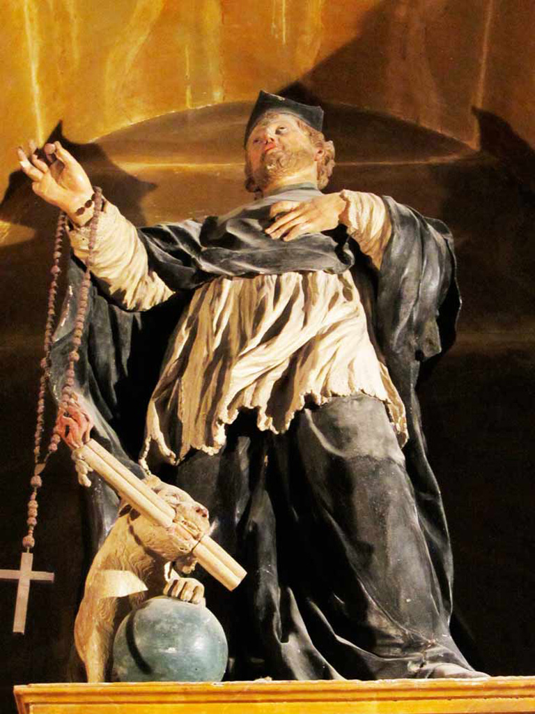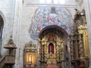 A Salamanca, tra le fatiche della vigilia e lo scombussolamento del primo giorno in gruppo, scendiamo dalle camere - un po’ in disordine ma puntuali - per la visita della città universitaria, sede di tante dispute intorno all’operato dei domenicani e fonte della nostra contemporanea apertura del concetto “sociale”: il riconoscimento dei DROITS DE L’HOMME. C’incamminiamo prima verso la magnifica Chiesa di San Esteban. Il gruppo si snoda alla spicciolata nelle vie della città, attraversa due piazze soleggiate (già alle 9, il cielo terso e un bel sole radioso fanno sembrare calda l’acqua degli spruzzatori della nettezza urbana) e, dopo un’ultima svolta, si presenta a noi la Chiesa dei Domenicani in tutto il suo splendore, con la sua facciata “illustrata”, il suo campanile a muro e con, antistante, la statua di Francisco de Vitoria, uno dei fondatori del Diritto Internazionale odierno. Prima della visita, noi pellegrini ascoltiamo la Parola e partecipiamo al Mistero della Santa Messa. Nonostante la novità dei luoghi, l’atmosfera è raccolta e gli inni (in italiano) serenamente allegri. All'uscita, nella sala conferenze, ascoltando la nostra guida,Ramòn Hernandez, scopriamo i misteri della Grande Disputa, poi andiamo ad ammirare la Chiesa e il Chiostro dei Domenicani, che sono delle pure meraviglie.