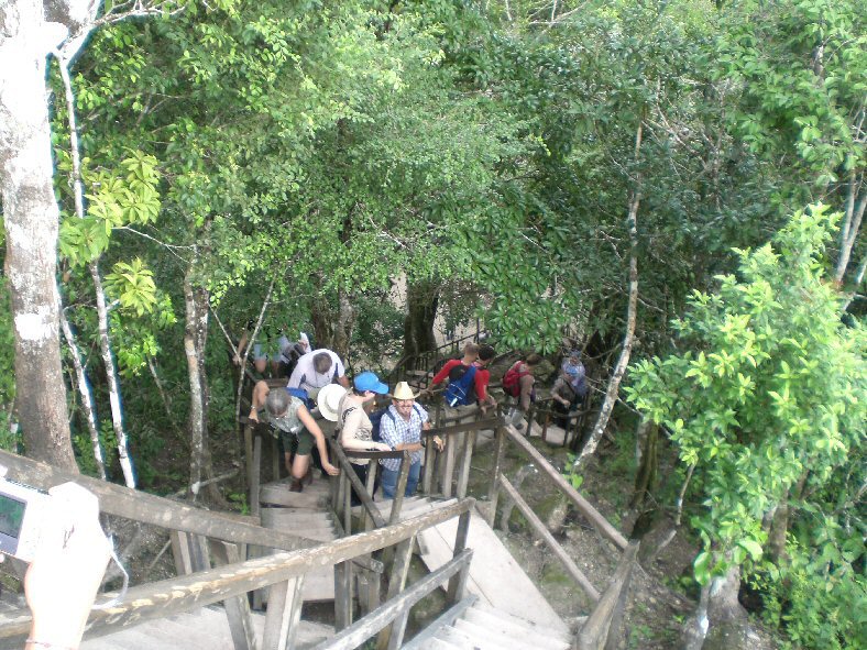 Ancora marcia e siamo nella “grande plaza” un'area rituale con imponenti piramidi che si affacciano su uno spazio grande come 2 campi di calcio messi insieme. Una delle delle piramidi può essere scalata… tramite scalette in legno ripidissime. Il mio angelo custode mi dice: ”Se cadi poi? Io sono un angelo per umani, non per elefanti…” il diavoletto dell’orgoglio mi convince a farmi i 60 metri di scalini e… altrochè sé ne valeva la pena! Una vista meravigliosa da mozzare il fiato a prescindere dalla fatica e poi giù con Franco dietro di me a consigliarmi per evitare errori irreparabili!