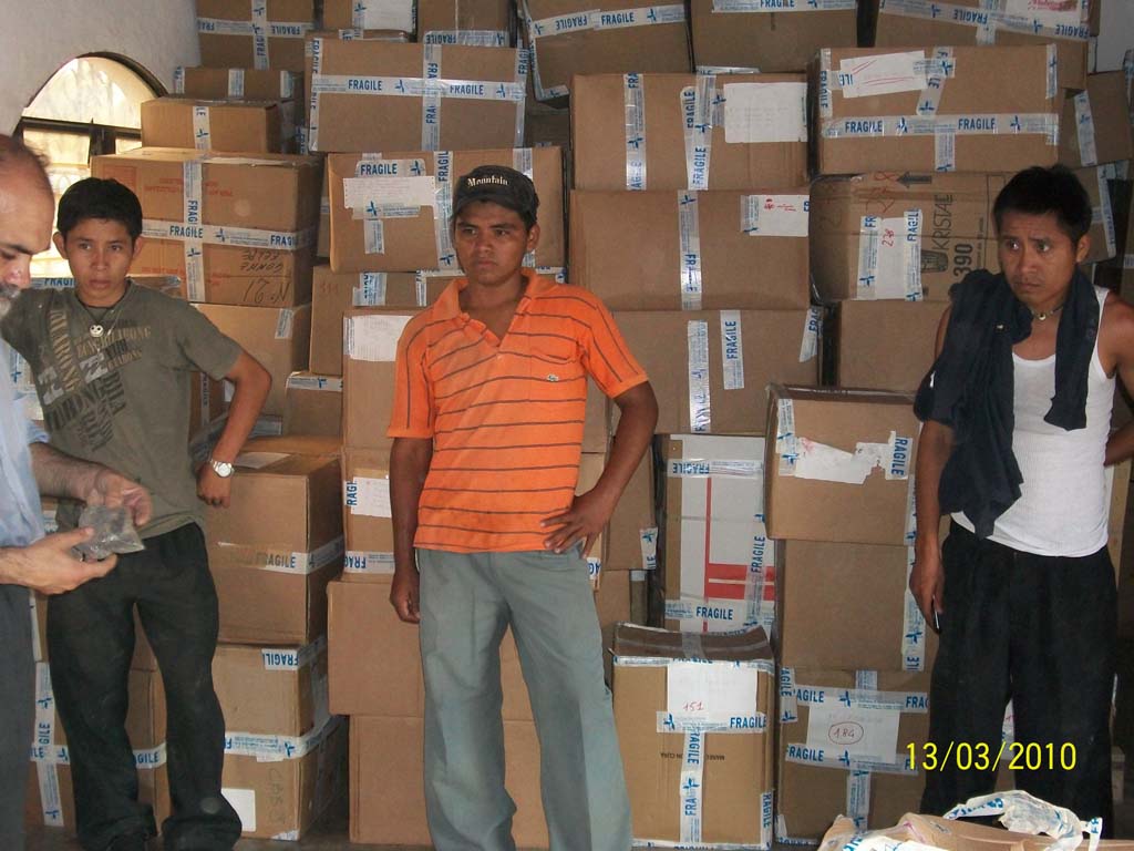 I ragazzi hanno cominciato a scaricare il mezzo guidati da P. Giorgio e da Francisco che cercavano di frenare la loro euforia che piano piano scema (le prime scatole “sembravano “ leggere, dopo si sono accorti che il “gioco” durava parecchio e le scatole si facevano sempre più pesanti). Franca ed io, elenco dei pacchi alla mano - fornitoci da P. Alberto prima della nostra partenza - spuntavamo i numeri, sistemando gli scatoloni a seconda del contenuto: da una parte il vestiario, di lato i farmaci, ancora vicino il materiale per l’aldea di Calzada Mopan, di fronte i giocattoli, sotto la champa gli alimentari, sotto la tettoia biciclette, lavandini, ferramenta e così via. Abbiamo cercato di dare un certo ordine per evitare di dover frugare e non riuscire a raccapezzarci più in tutto quel ben di Dio. Alle 10.00 abbiamo finito di scaricare ed i ragazzi hanno adocchiato i giochi. Nonostante abbiano dai 17 ai 22 anni si sono fatti prendere dalle palline da tennis e uno, quello che la sera della festa ha fatto i giochi con il fuoco, si è messo a fare il giocoliere con tre palline. Gli altri lo hanno seguito.
