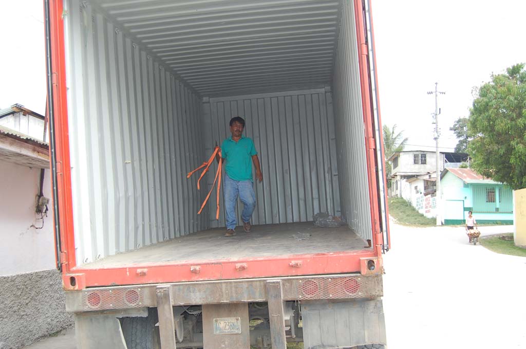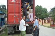 Assieme a Francisco ed a P. Giorgio sono arrivati anche sei ragazzi della scuola e così dopo i preliminari burocratici abbiamo cercato di rompere il sigillo che chiudeva il container e che era di ferro. Le pinze che avevamo a disposizione se pur grosse non erano adatte alla bisogna e mancava un seghetto che ci avrebbe permesso di accedere al “tesoro”. Con un po’ di pazienza e molta lena Francisco è riuscito nell’intento e finalmente ecco spalancarsi le porte del container ed apparire le prime cose: giocattoli, biciclette, medicinali, macchine per cucire, macchine per scrivere, borsoni con attrezzatura sportiva, altalene, reti metalliche, scatoloni di materiale didattico, registratori, segreterie telefoniche, scatoloni di alimenti e tanto tanto vestiario.